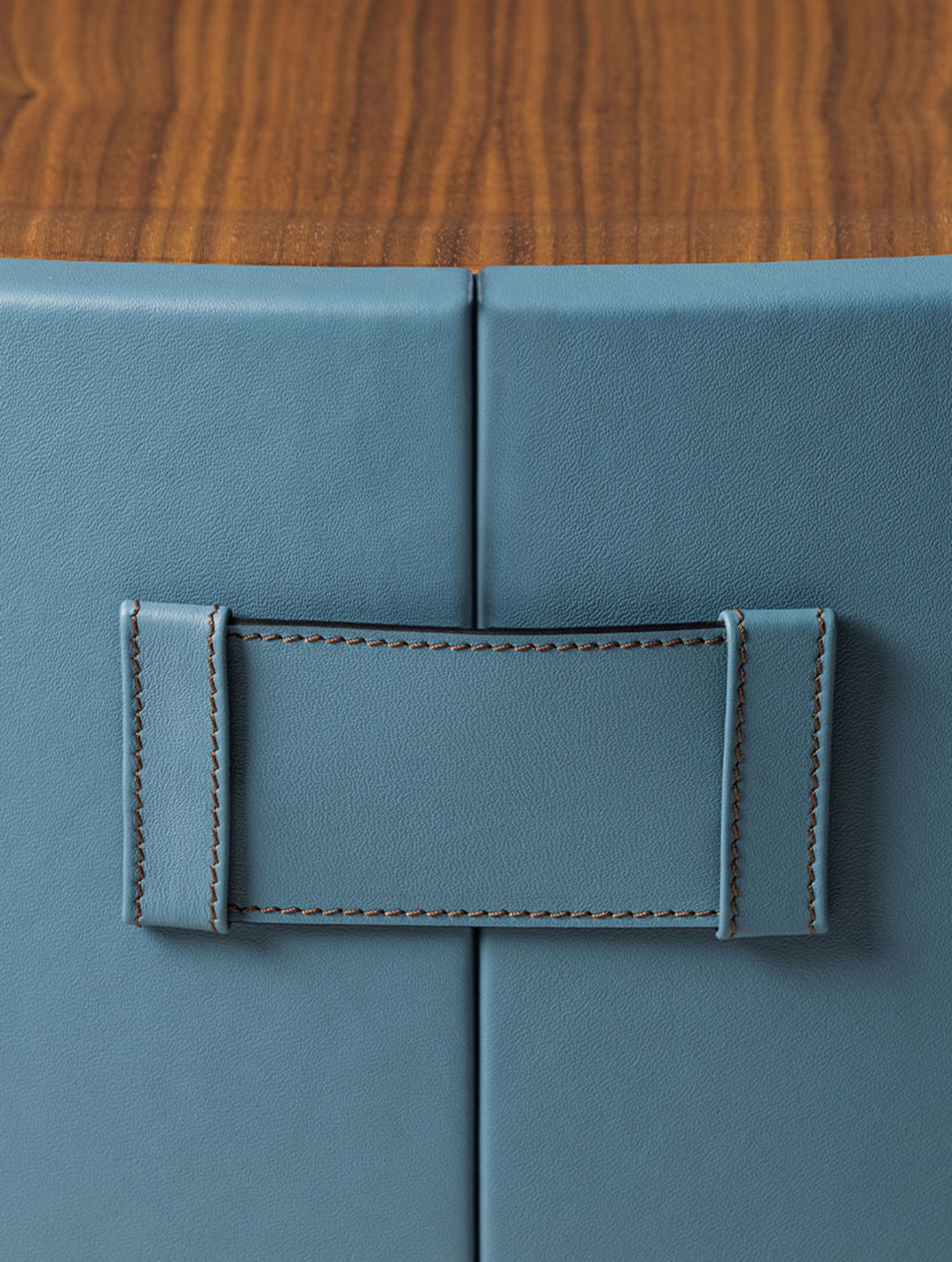 The structure is crafted from precision-molded curved plywood, providing both strength and fluid form. It is fully upholstered in leather, delivering a refined tactile finish and enhancing the sculptural silhouette. The top is made of solid walnut wood, selected for its durability, rich grain pattern, and natural tonal depth, offering a warm contrast to the upholstered base. The seams are executed tone-on-tone and available in three thread intensities—light, medium, or dark—allowing subtle customization while maintaining a cohesive, sophisticated aesthetic.