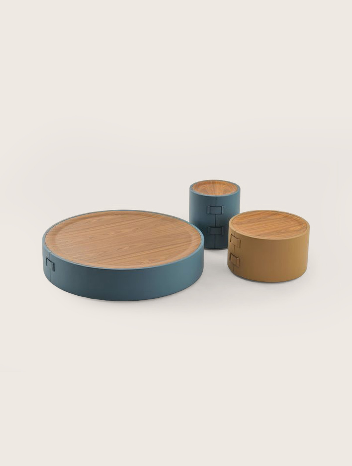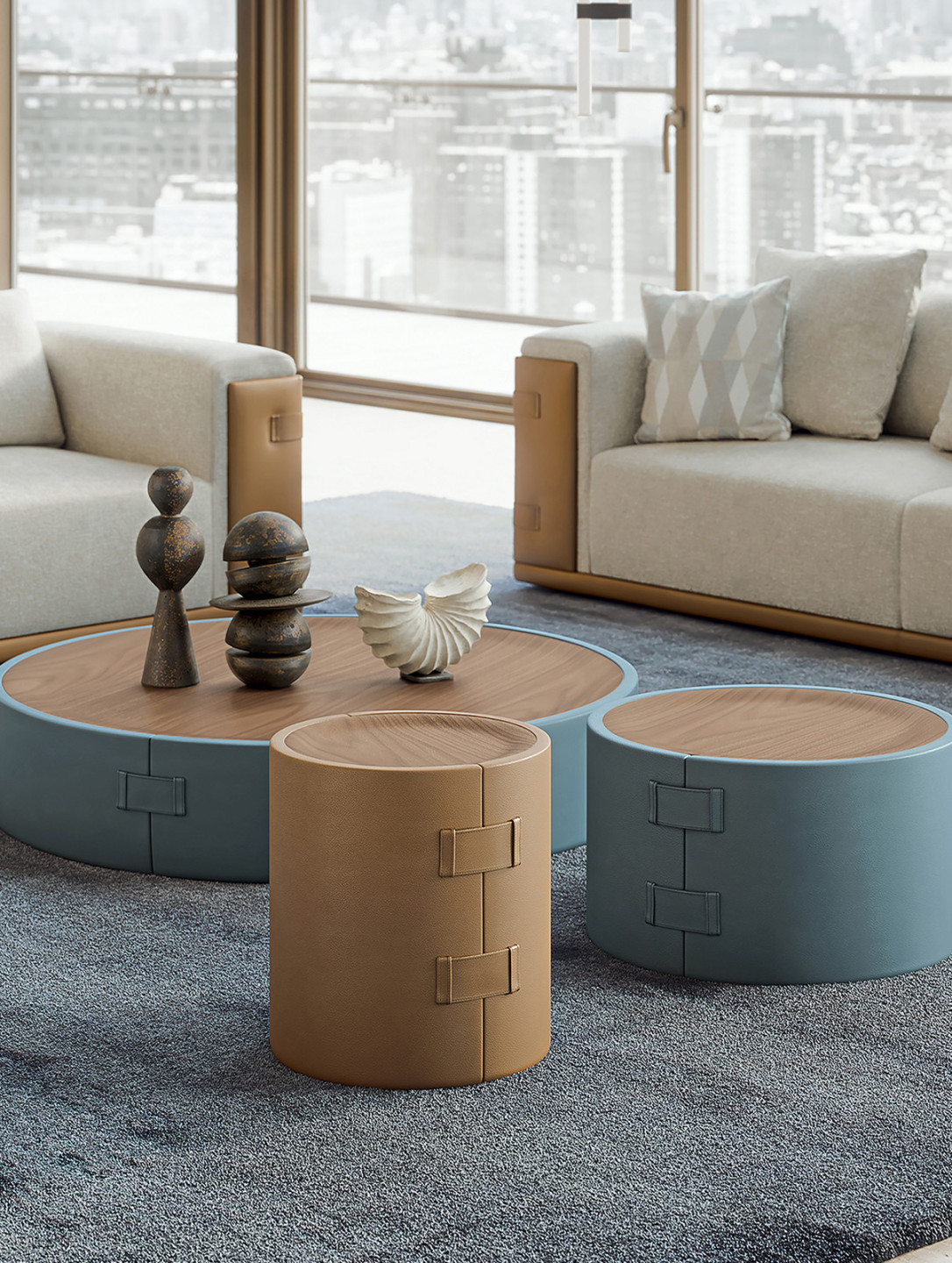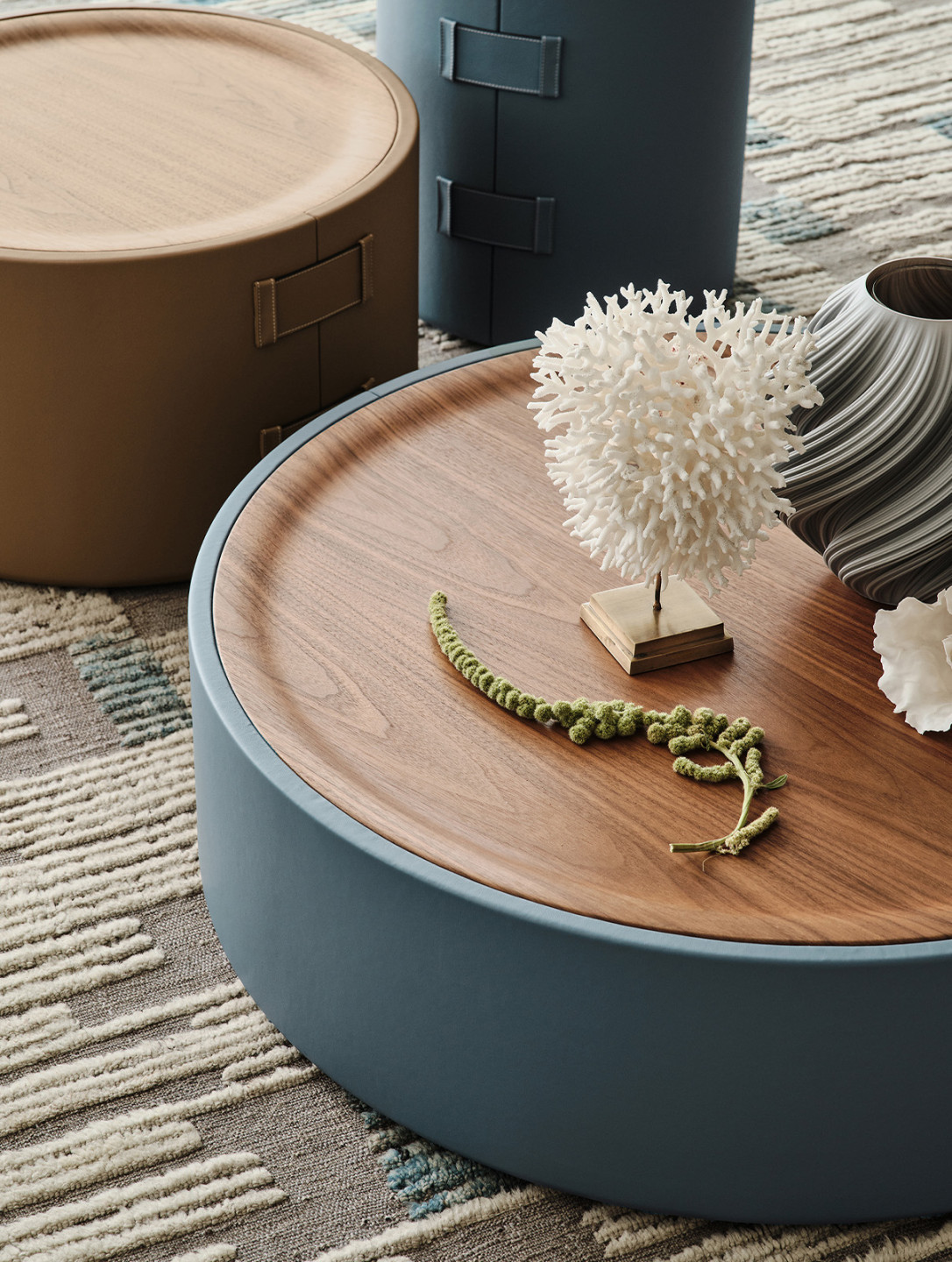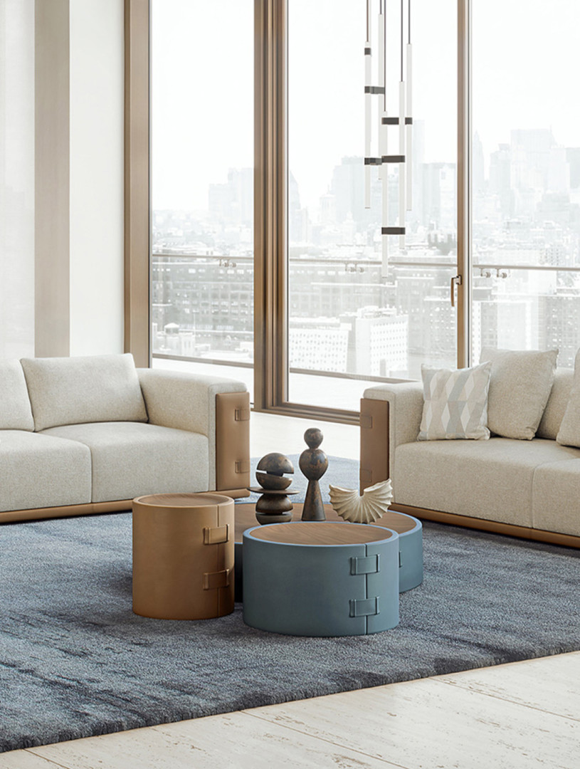 A series of cylindrical coffee tables. Wrapped in leather and finished with signature buckle accents, each piece draws from the language of fine Italian leather goods.