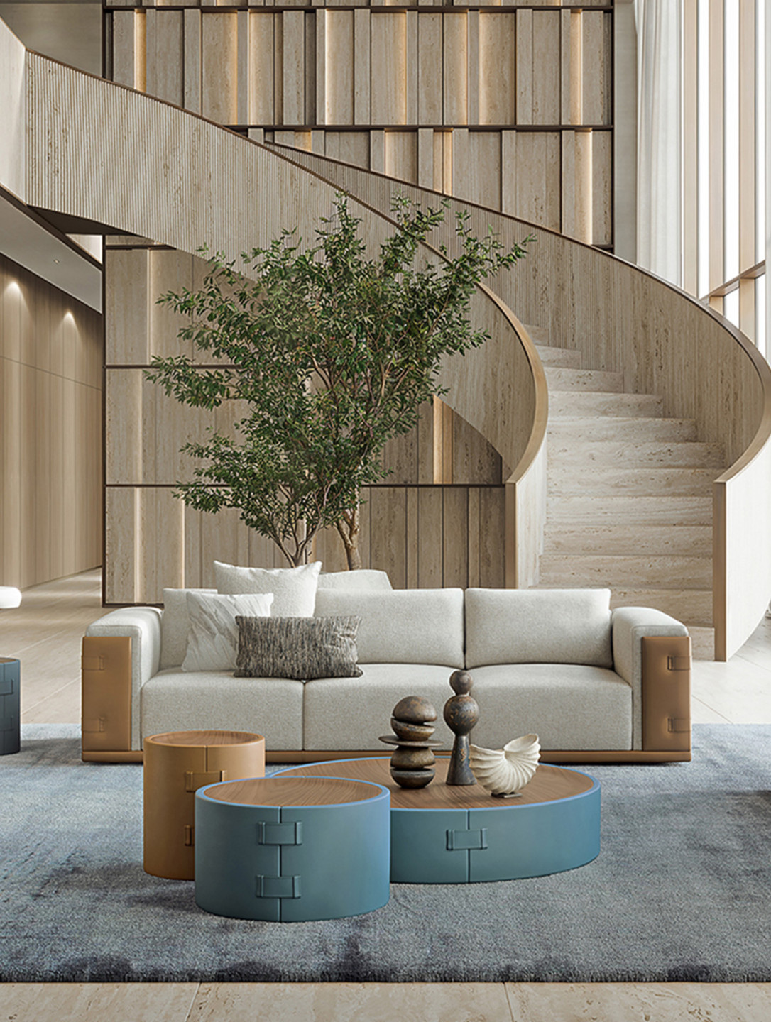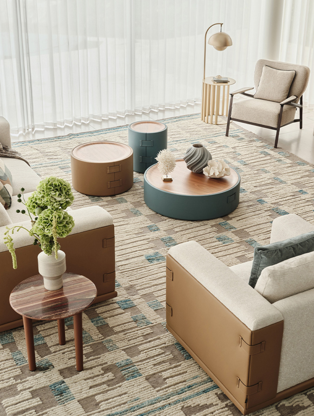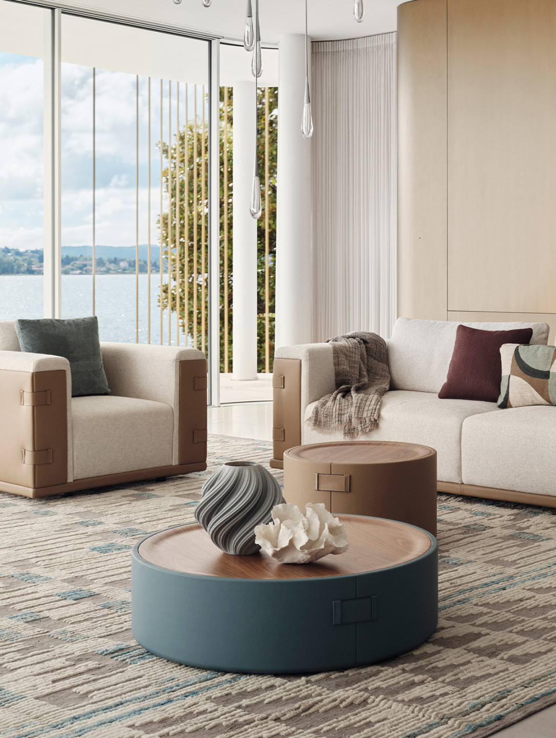 A series of cylindrical coffee tables. Wrapped in leather and finished with signature buckle accents, each piece draws from the language of fine Italian leather goods.