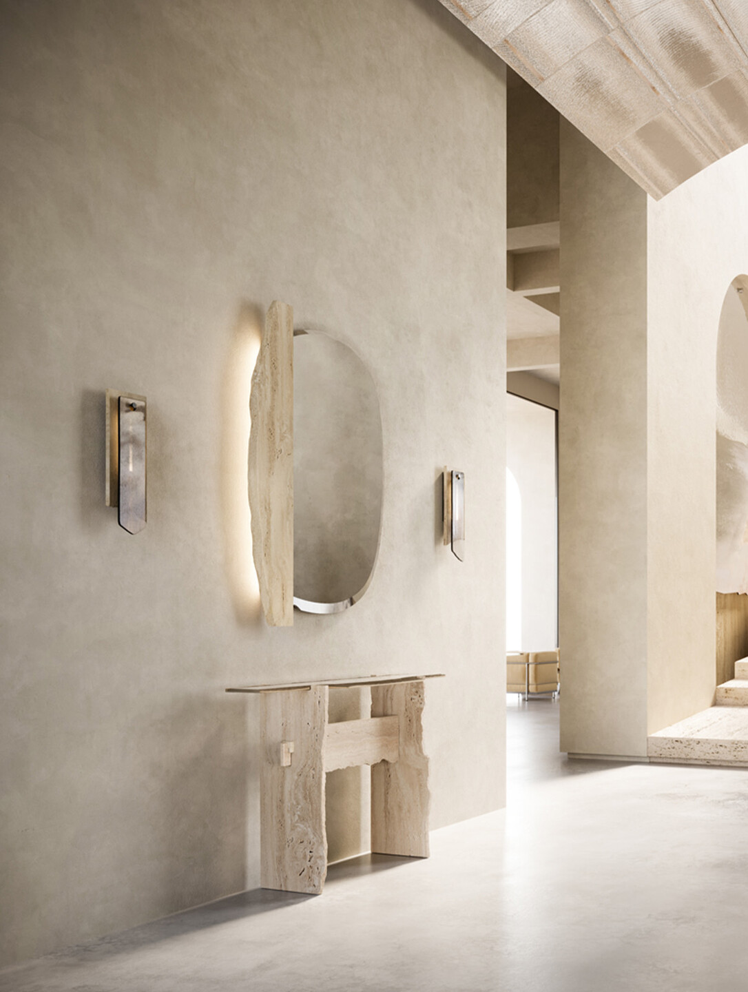 Inspired by the textures and tonal variations of Italy’s historic stone quarries, the piece captures a sense of organic beauty through a contemporary lens. Crafted with a travertine marble base and topped with extra-clear glass in a Miage finish, Barco achieves a striking balance between solidity and lightness. Meticulously handmade, it reflects Arte Veneziana’s dedication to material excellence, resulting in a console that functions as both a practical piece and a sculptural focal point within any interior.