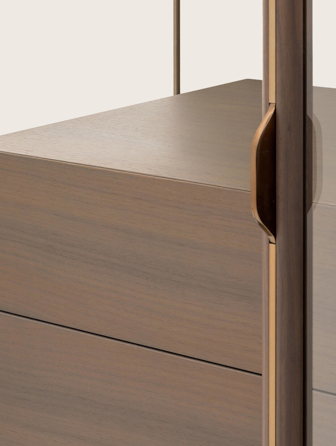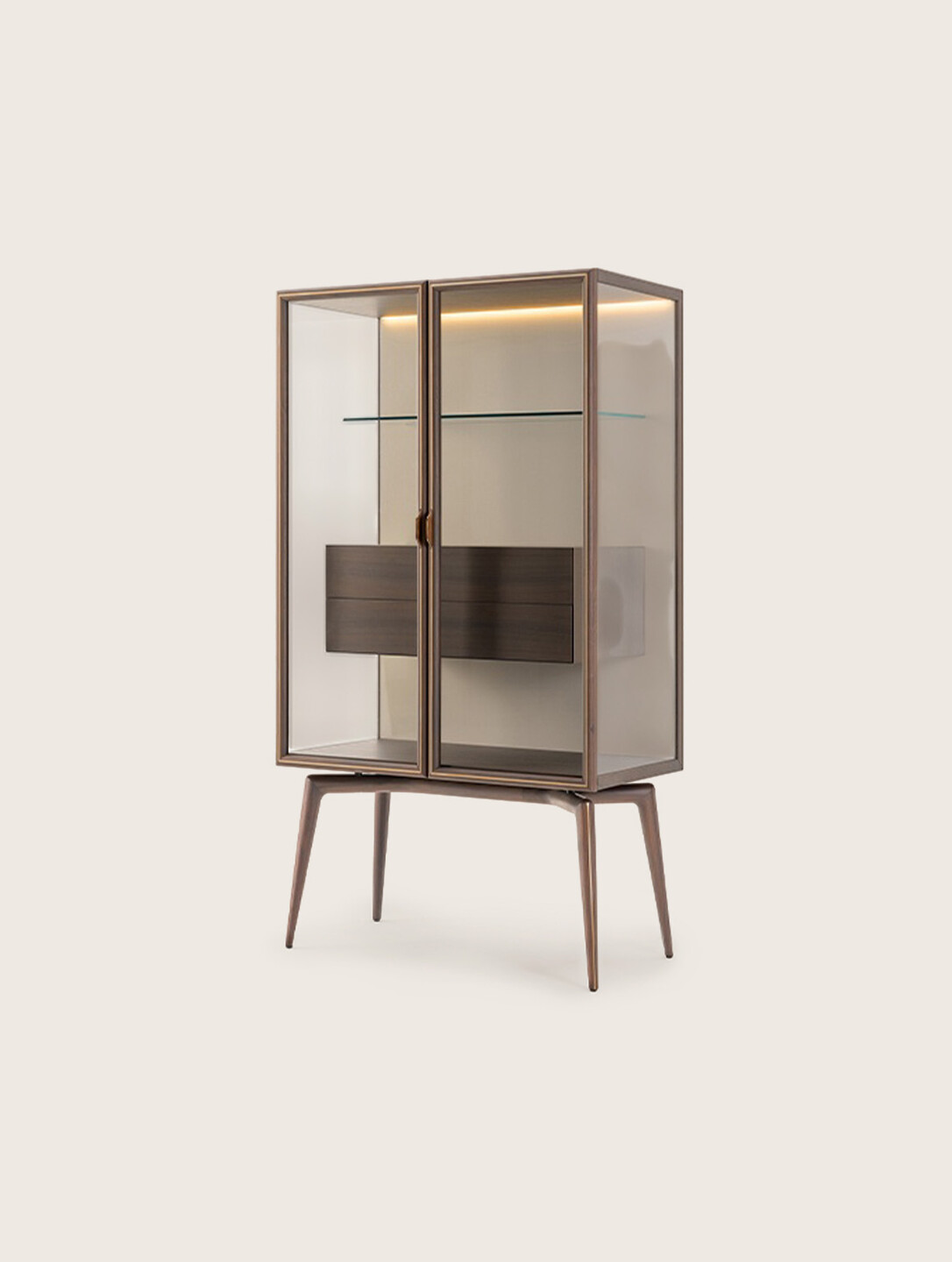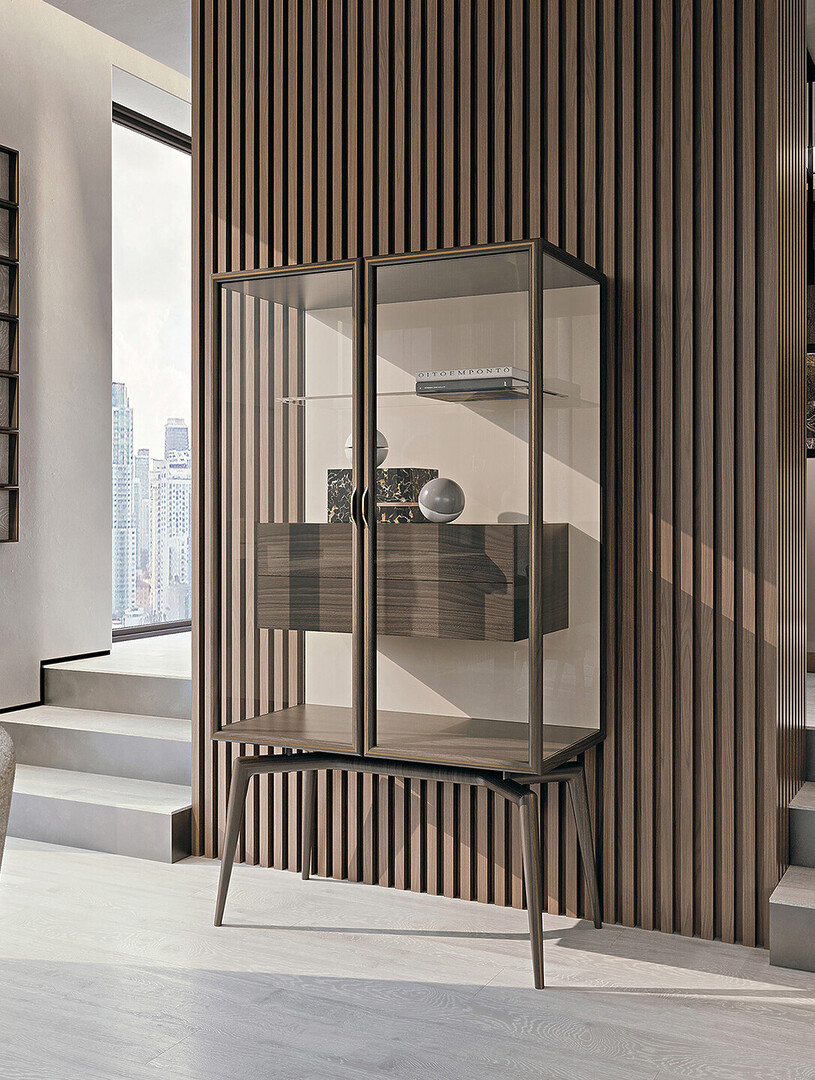 The Blues Vitrine brings a refined sense of modern luxury to interior spaces through its harmonious balance of form and function. Crafted with a combination of MDF, plywood, solid wood, and walnut veneer particle board, its structure and legs offer both strength and sophistication. The piece is fitted with two doors, available in either bronzed or extra-clear glass, allowing for a tailored display aesthetic. Its back panel can be customized in leather, a monocolor glossy polyester lacquered wood finish, or walnut veneer, while the interior features two walnut veneer drawers, a glass shelf, and integrated LED lighting. Accented with Light Gold or Audrey Bronze metal finishes, it delivers a timeless expression of elegance and refined detailing.