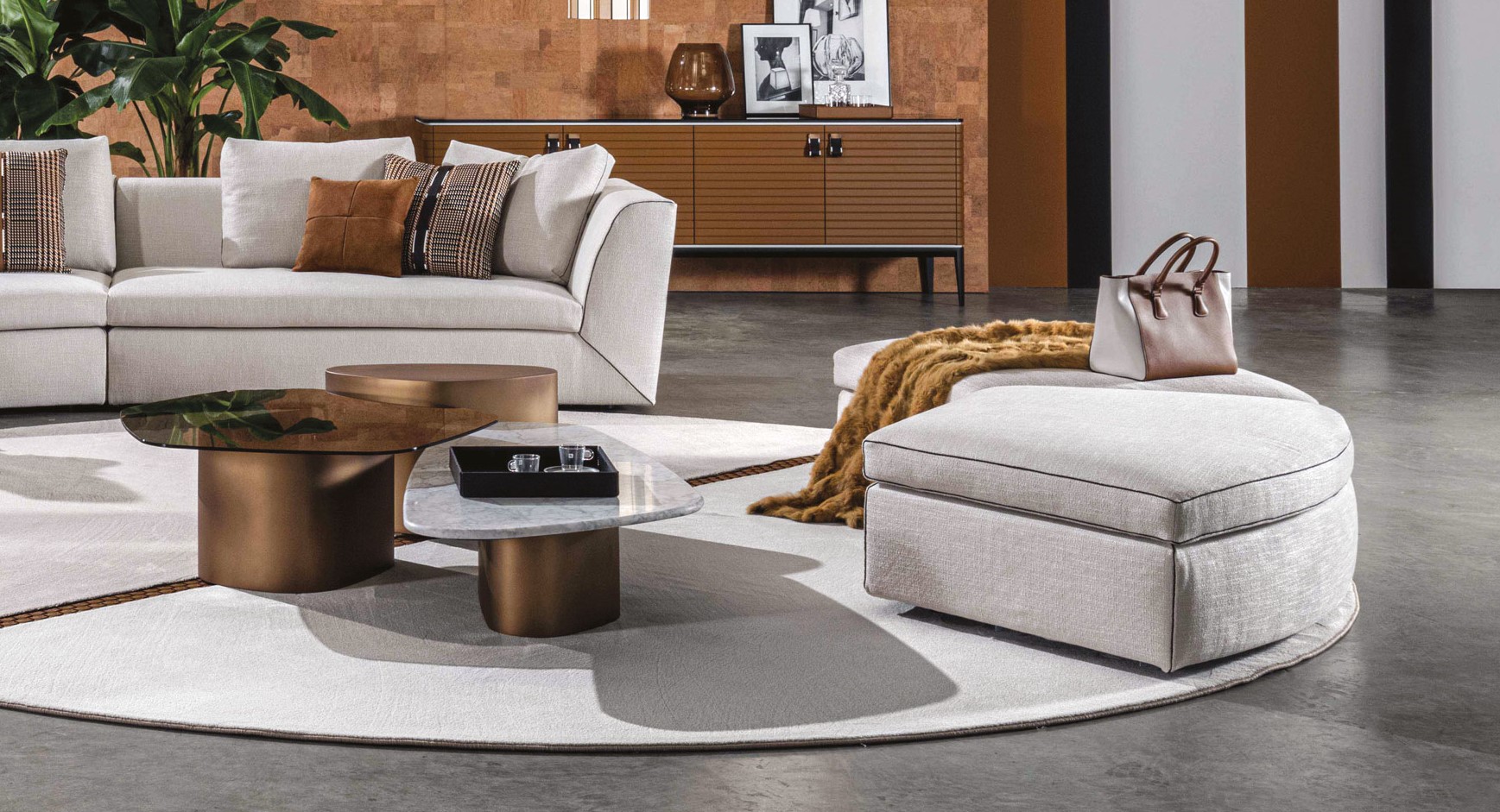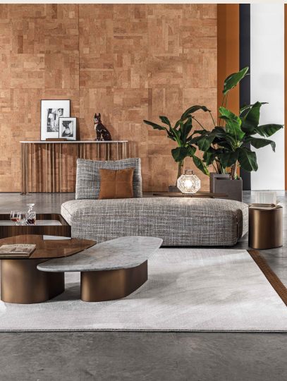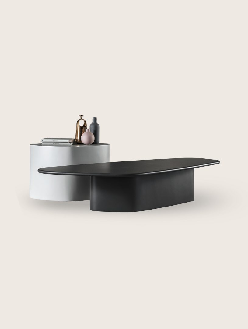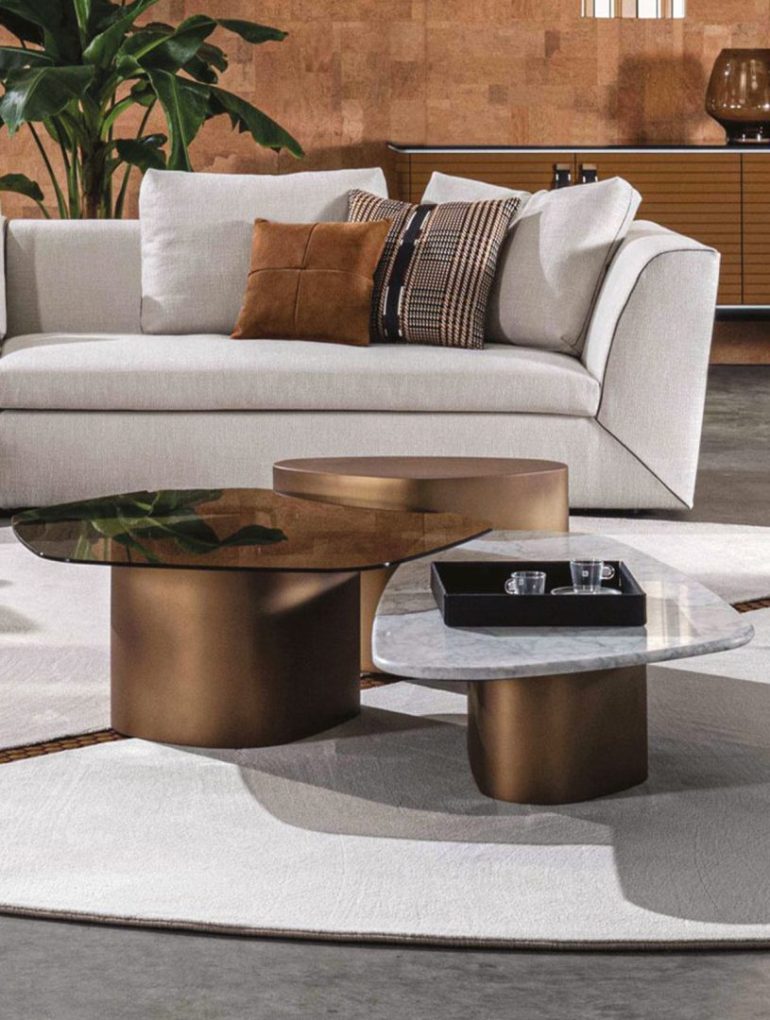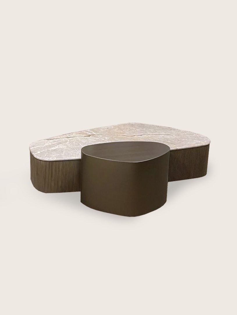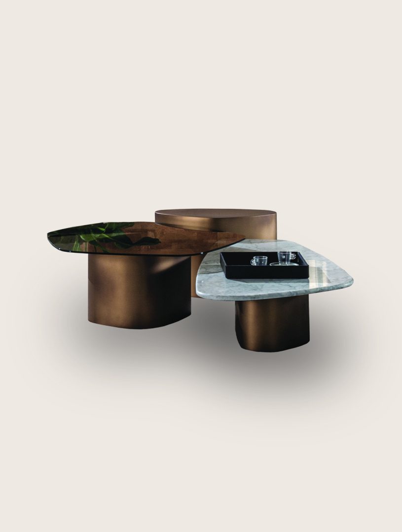 A collection of coffee and side tables defined by the interplay of glass, marble, and wood, composed in refined finishes. Contemporary in spirit, each piece balances material contrast with a sculptural presence.