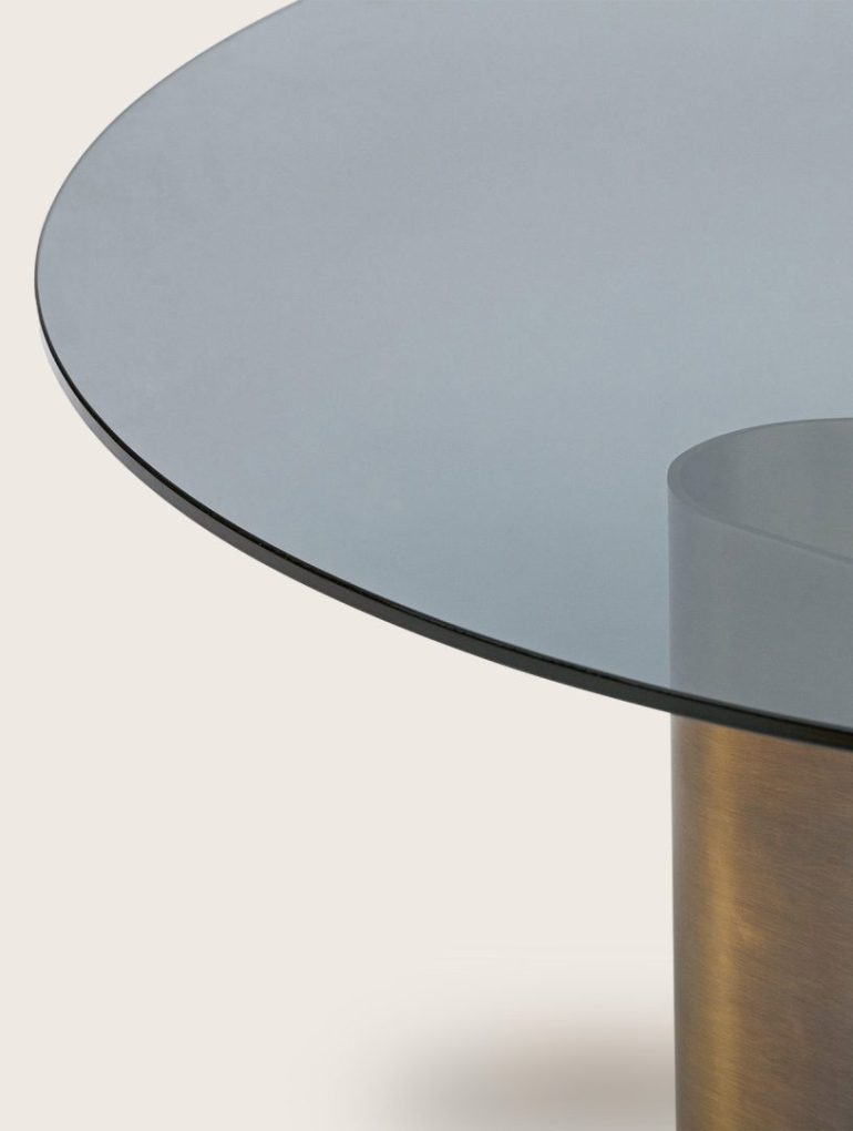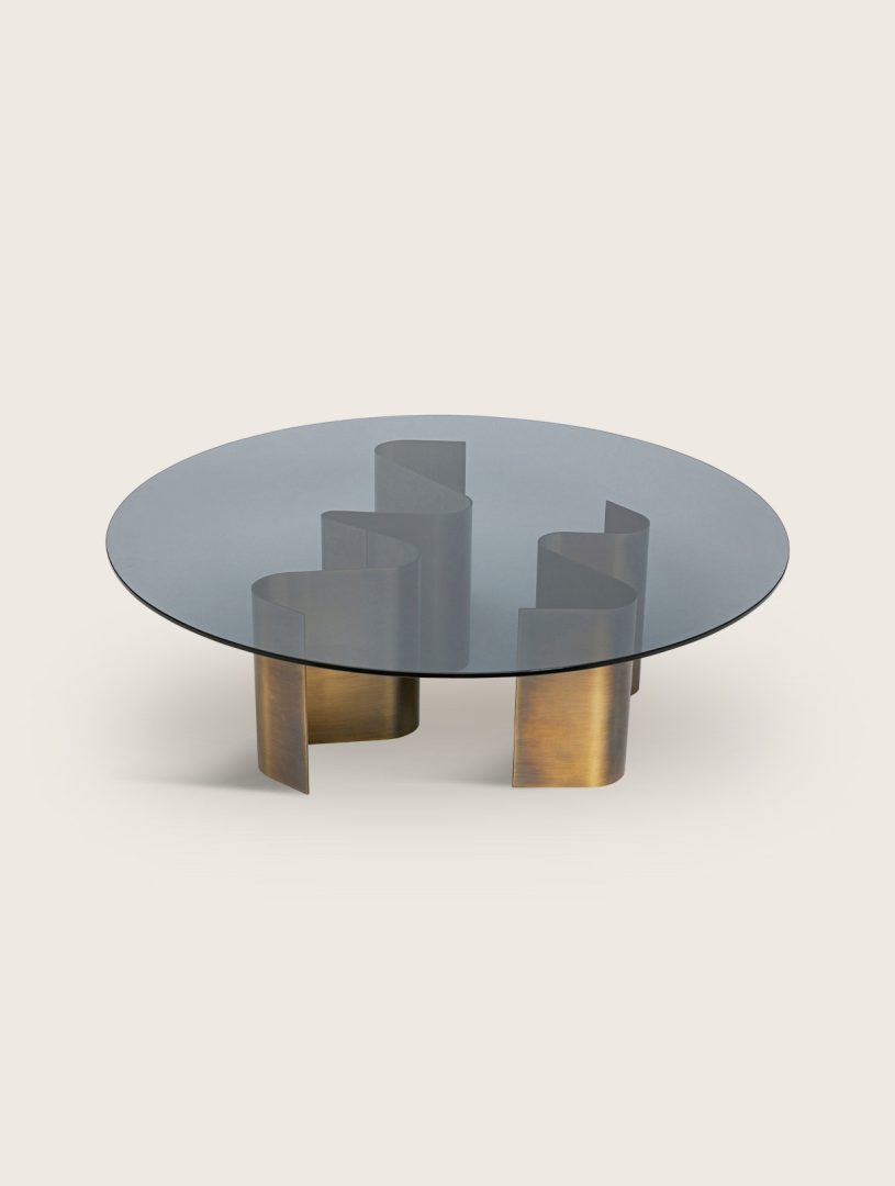 A sculptural low table defined by its fluid brass base, shaped with a sense of movement and material richness. The base is available in satin, bronzed, or hammered finishes, each offering a distinct expression of light and texture.