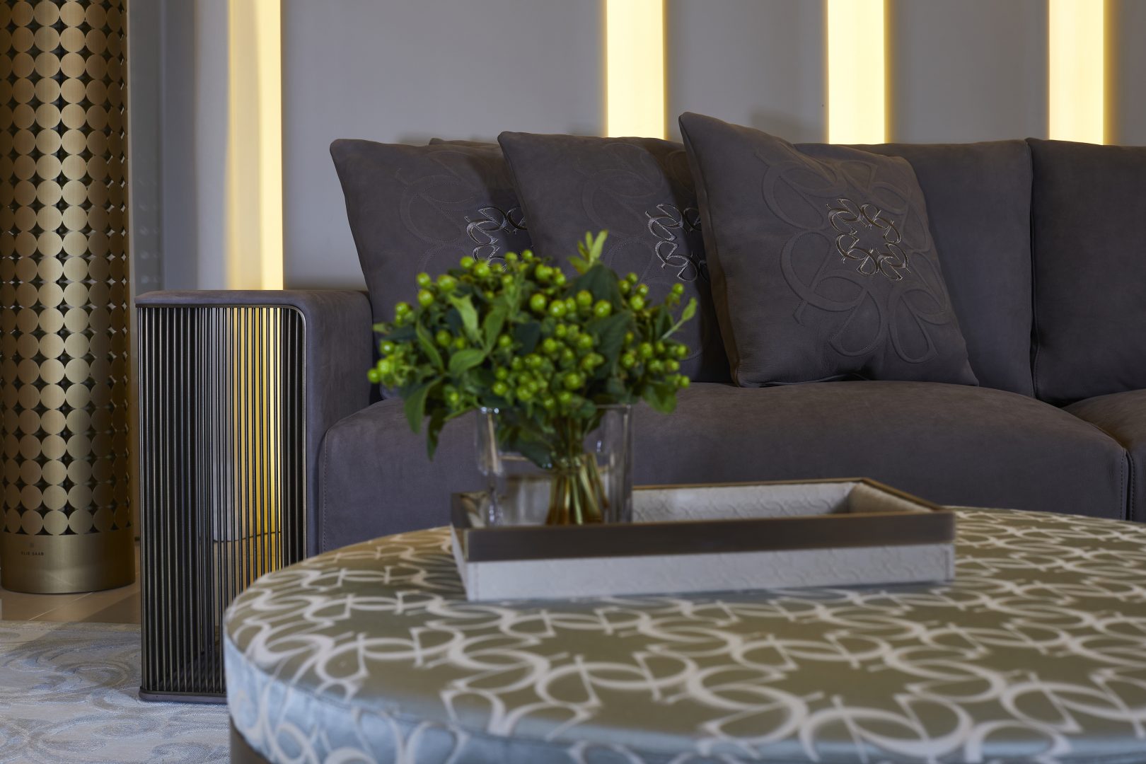 - The ECUSSON Cushion by ELIE SAAB features a refined nabuk exterior with a soft, matte finish.