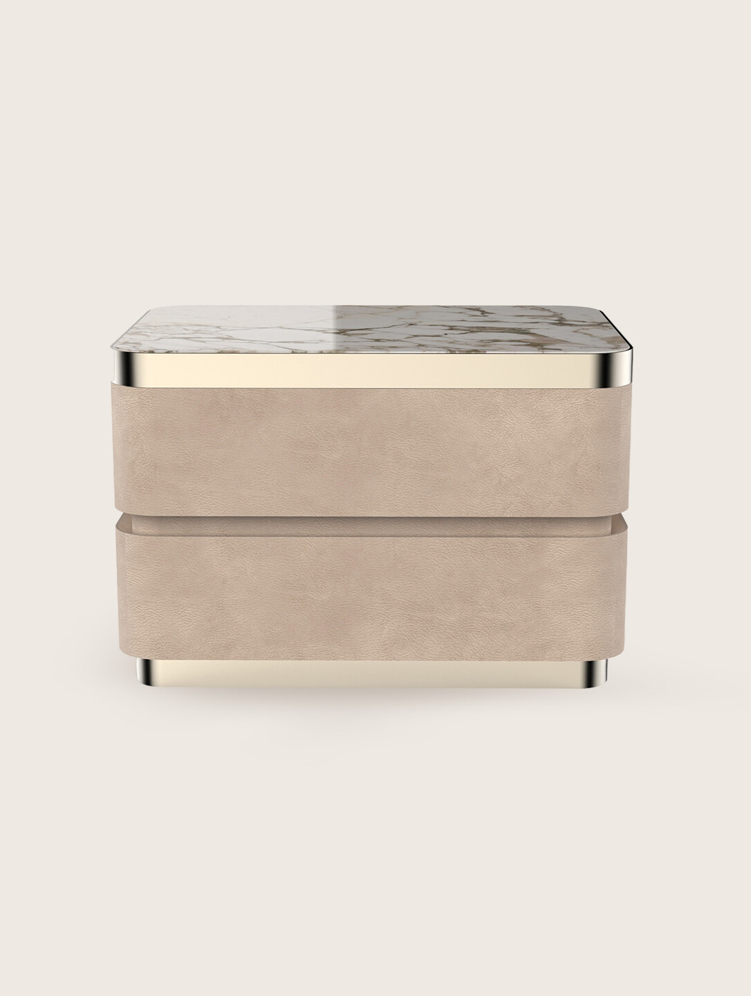 The Essence Bedside Table by Elie Saab Maison is a precisely crafted piece with a plywood structure, available in two sizes, 50 and 75. Its top and internal shelves are finished in painted glass, with the option to customize the top in marble or stone from the collection. Refined metal details are offered in bronzed and polished brass or black nickel, while drawers are lined in microfiber for a soft, protective interior. Designed for cohesion, it pairs seamlessly with the Essence dresser to complete the collection.