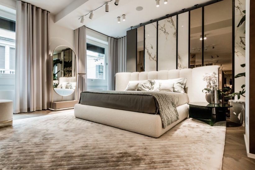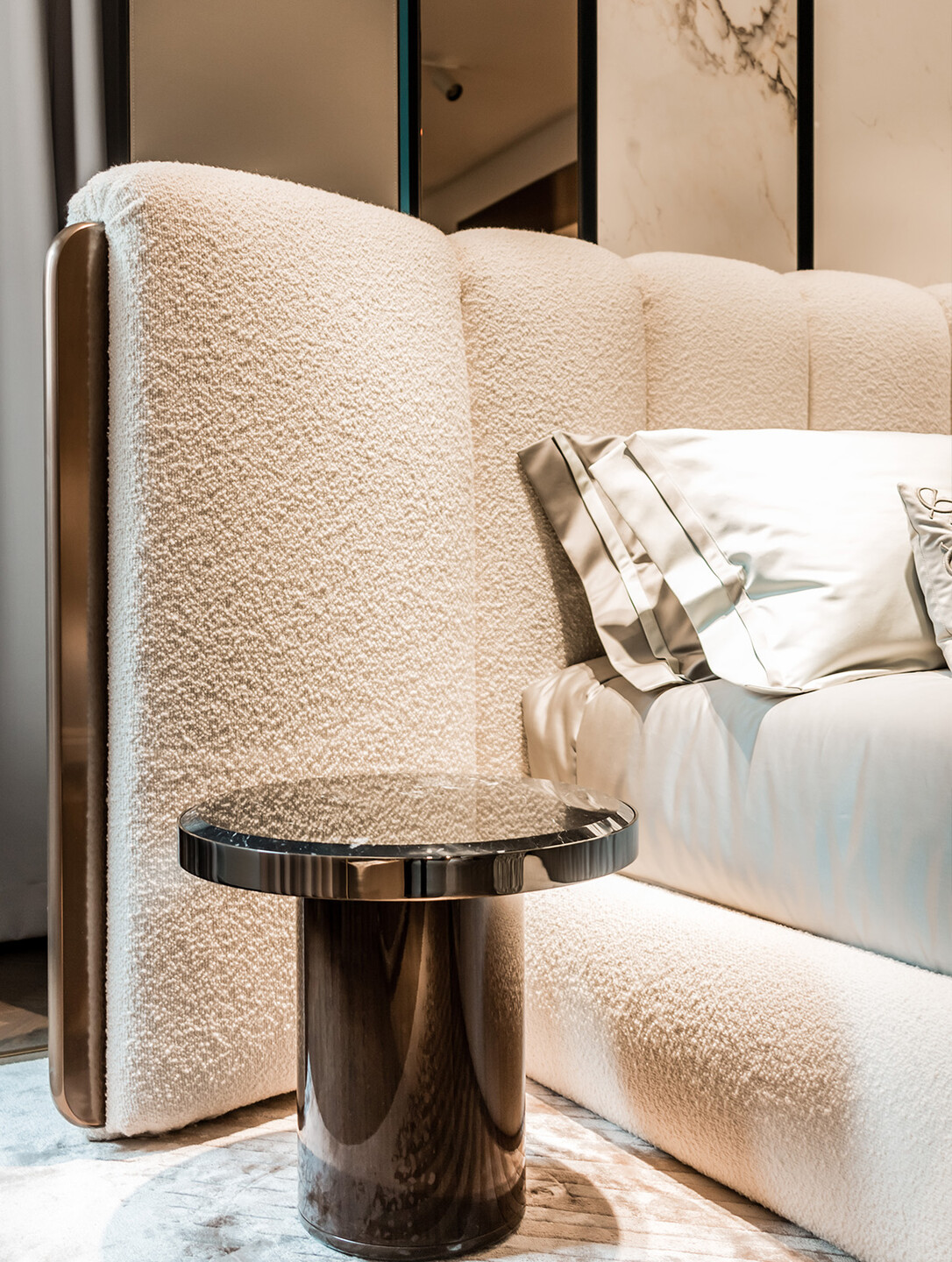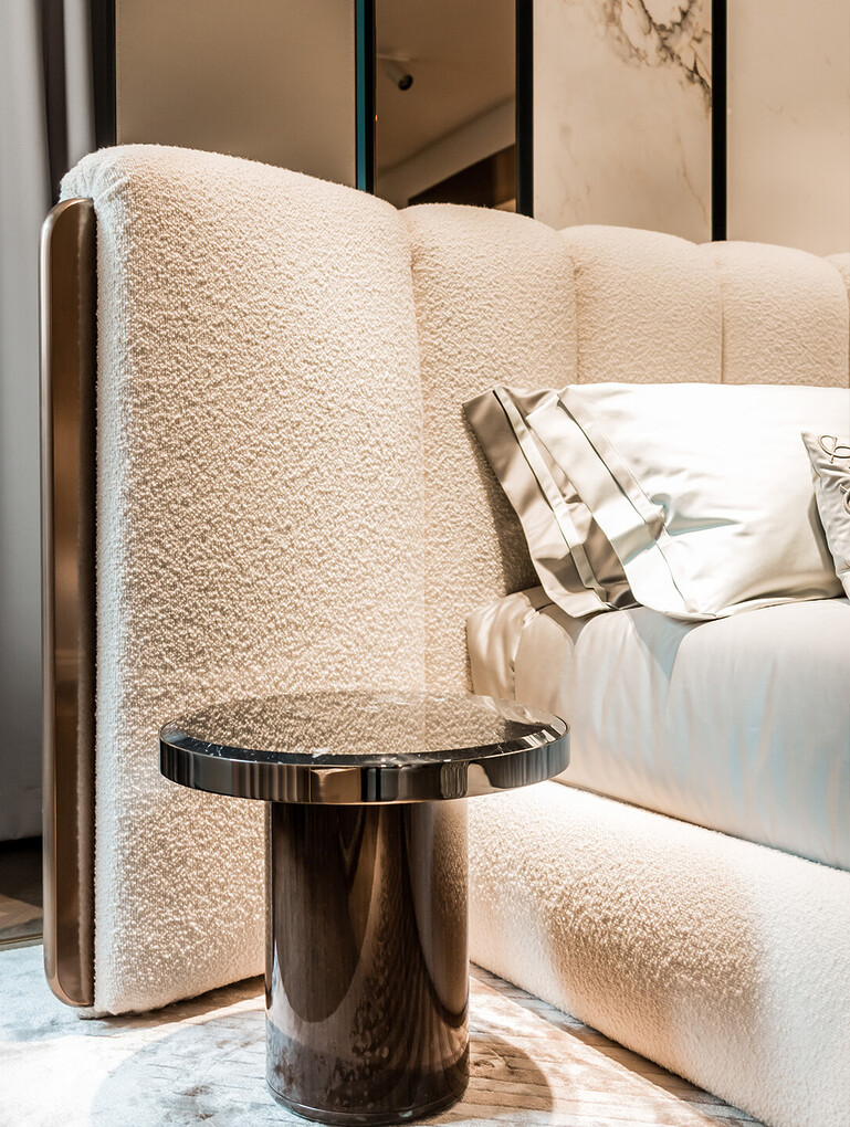 An expression of Elie Saab’s haute couture language translated into furniture, the Kate Bed is defined by its sculptural headboard—composed of individual upholstered elements that come together to form generous, enveloping volumes. Available for Queen and King mattresses, with custom sizing upon request.