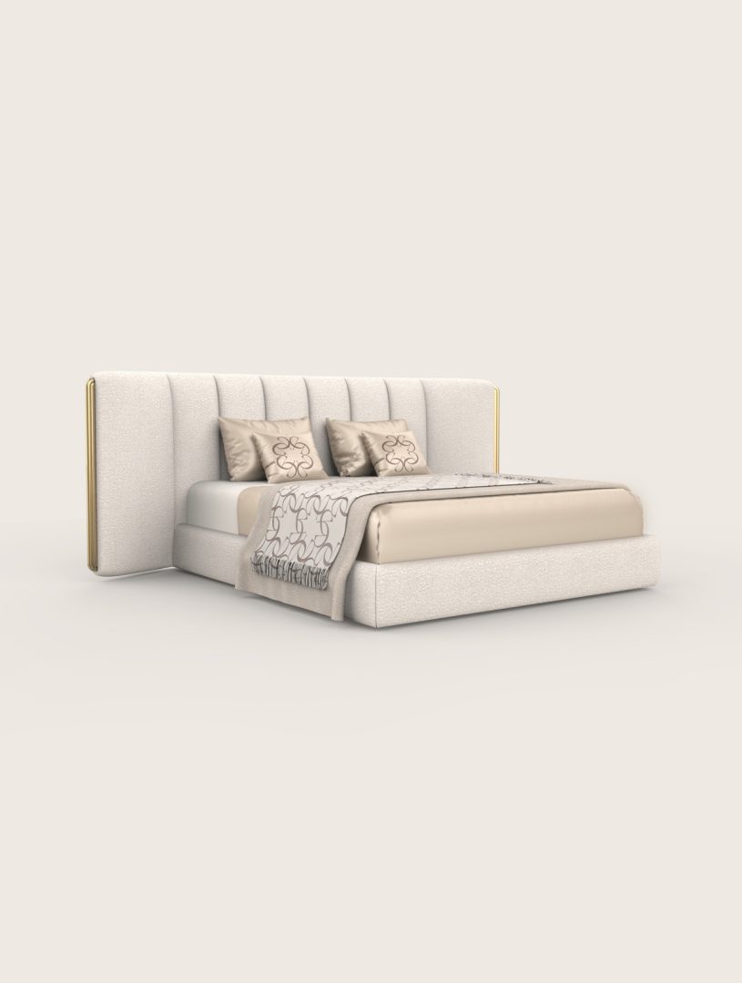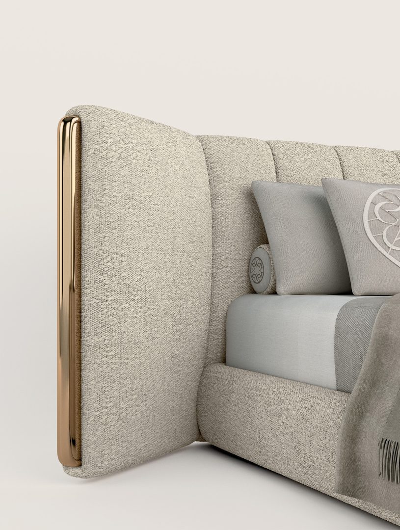 A refined blend of comfort and design, this bed features a durable plywood and polyurethane foam structure, upholstered in fabric or leather from the collection. The headboard is composed of individual padded elements arranged side by side, creating generous, sculptural volumes, enhanced by elegant liquid metal details. Available for 180 cm and 200 cm mattresses, the bed frame includes height-adjustable supports. Mattress and slatted base not included.