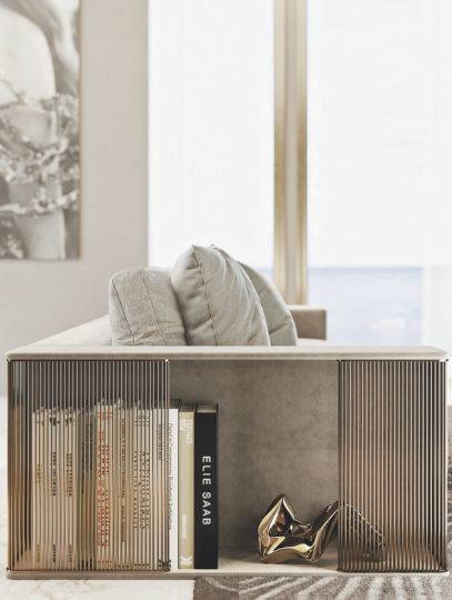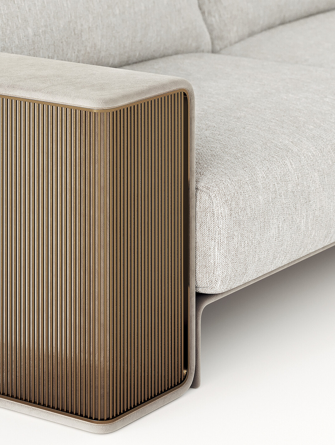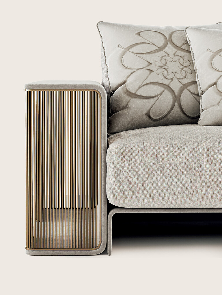 Series of modular sofas covered in fabric or leather from the collection. The structure is in plywood. The armrests are characterized by an original element made of metal with a bronzed finish or in polished nickel. Armrest and front structure in leather. Extra Finishing available with Leather armrest lining.