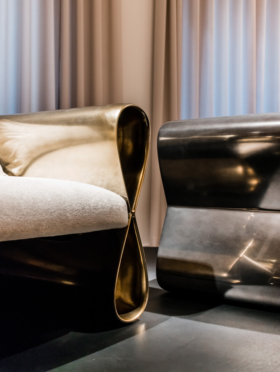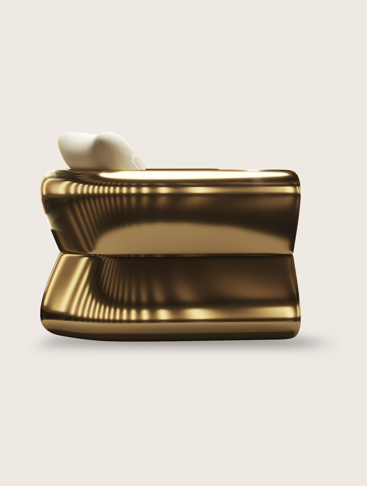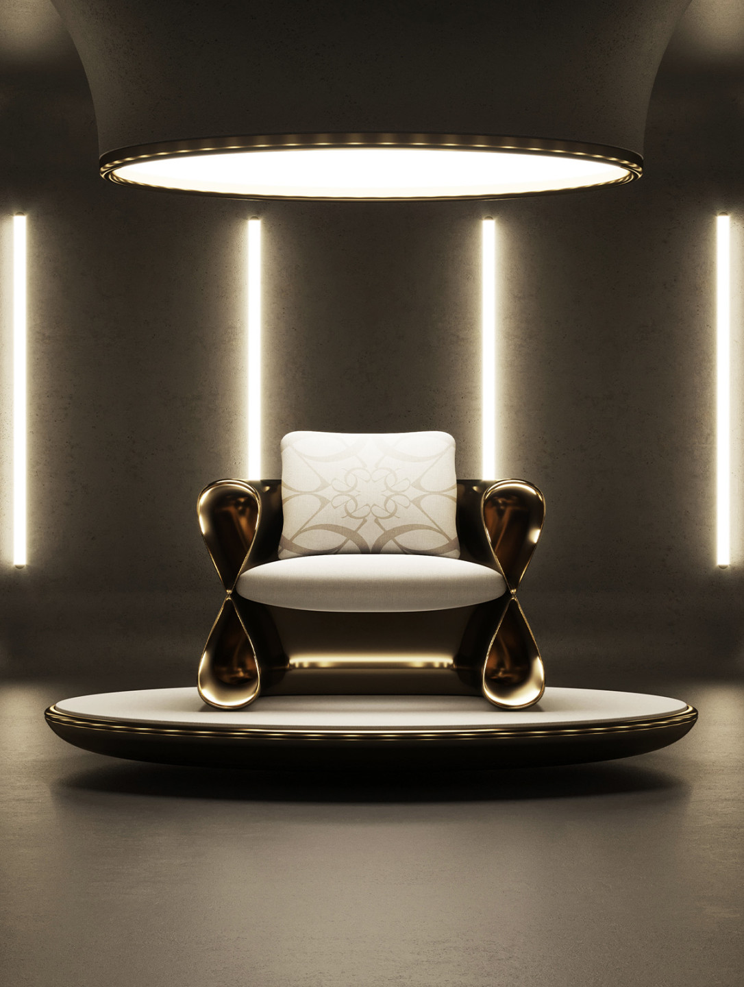 Its distinctive form is defined by two flowing, sculptural lines that loop into elegant infinity shapes, seamlessly framing the seat. This fluid structure creates a visual sense of movement and unity, with no clear beginning or end. Meticulously crafted in Italy, the armchair pairs innovative engineering with luxurious finishes, resulting in a piece that is both technically advanced and aesthetically captivating. The L’infini Armchair transcends traditional furniture design, offering a bold statement of modern luxury and artistic craftsmanship.