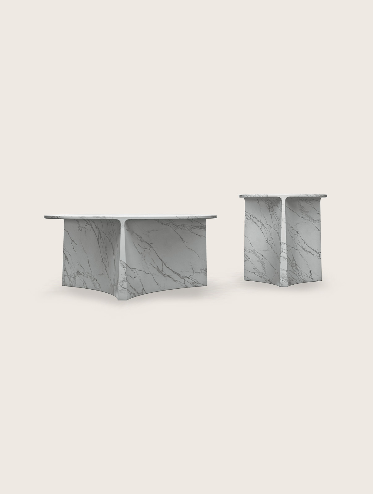 The Mirage Low Tables by Elie Saab Maison are elegant, one-piece marble sculptures.