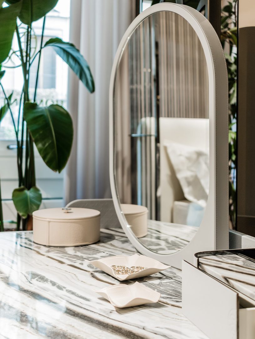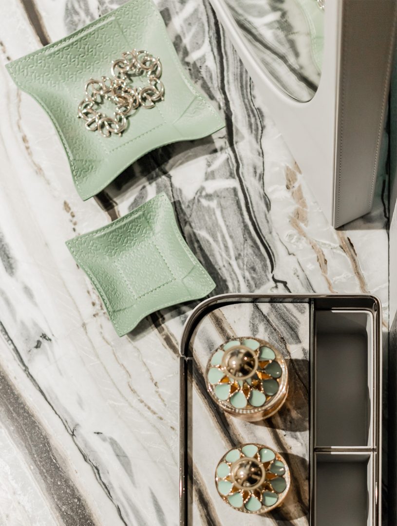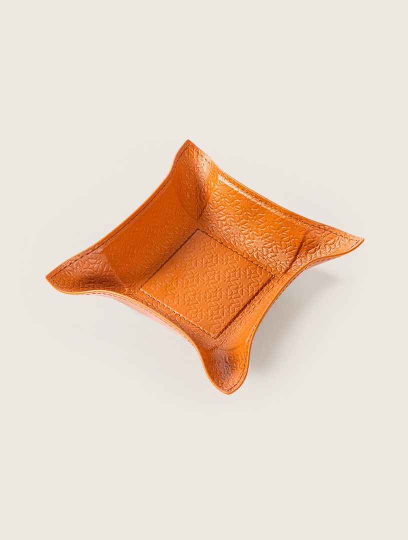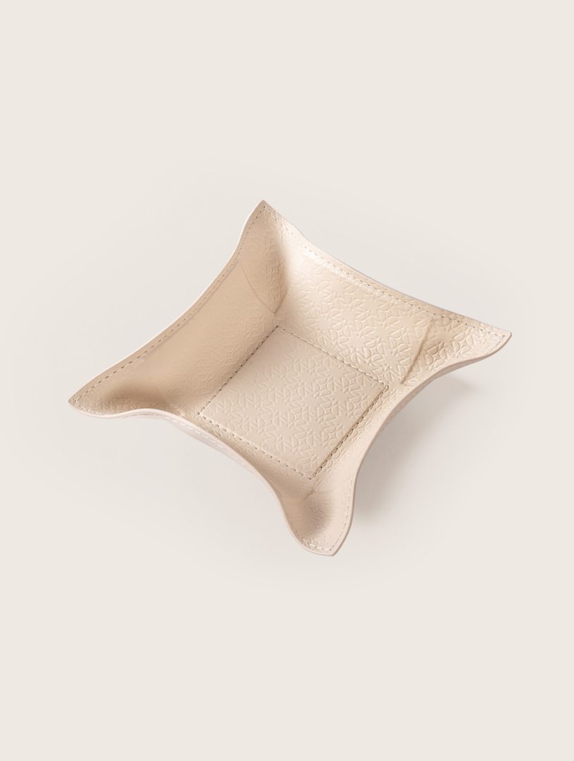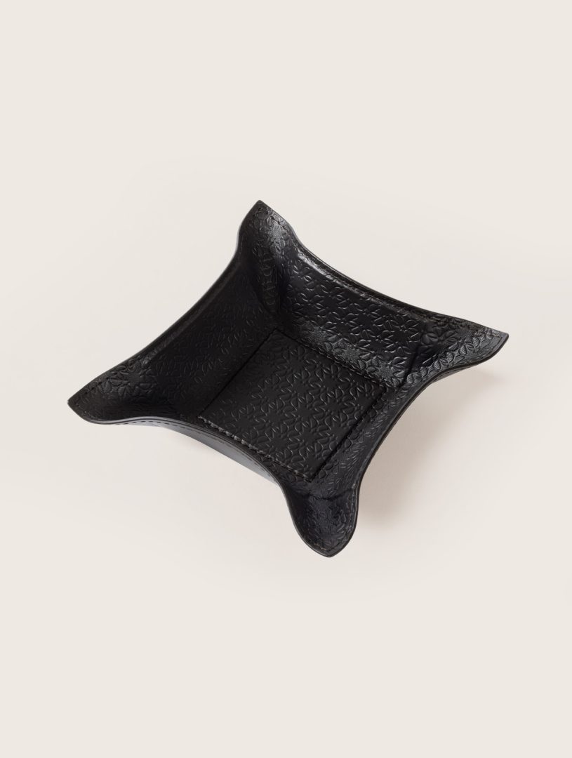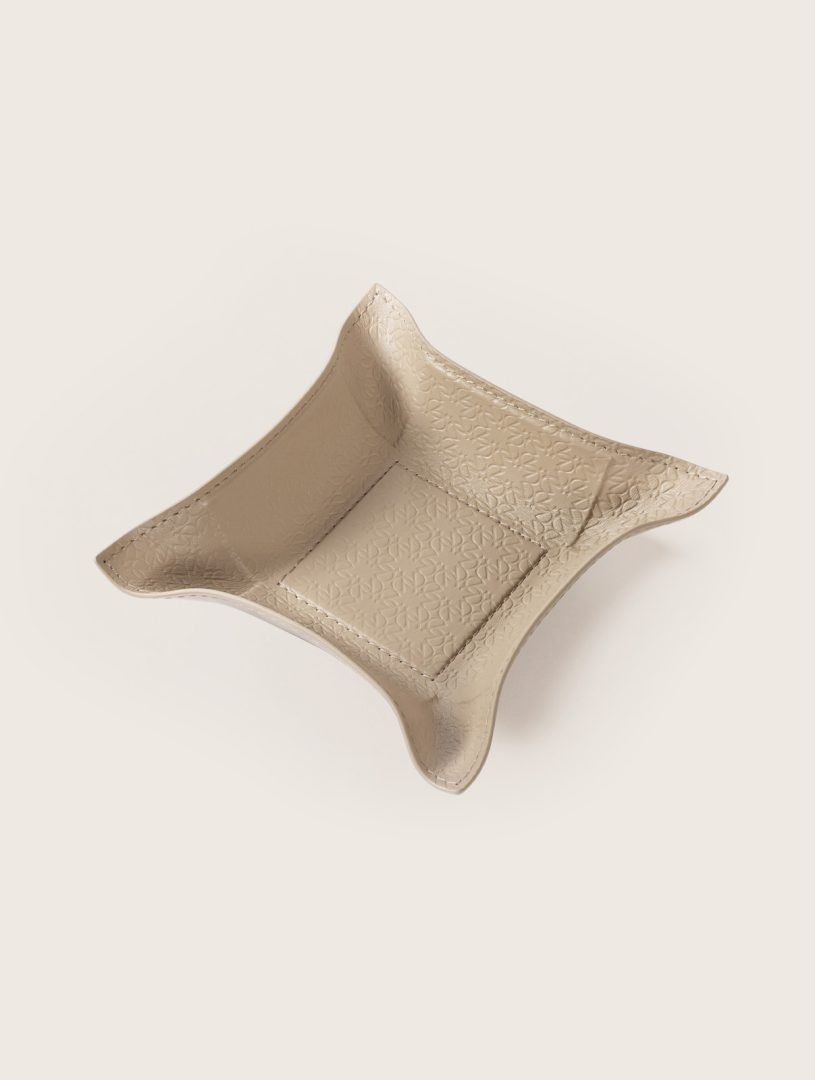 Giobagnara x Elie Saab: a fusion of two iconic brands. Valet tray with leather lining featuring the ELIE SAAB Monogram pattern. It features a metal structure with rigid core and bendable sides.