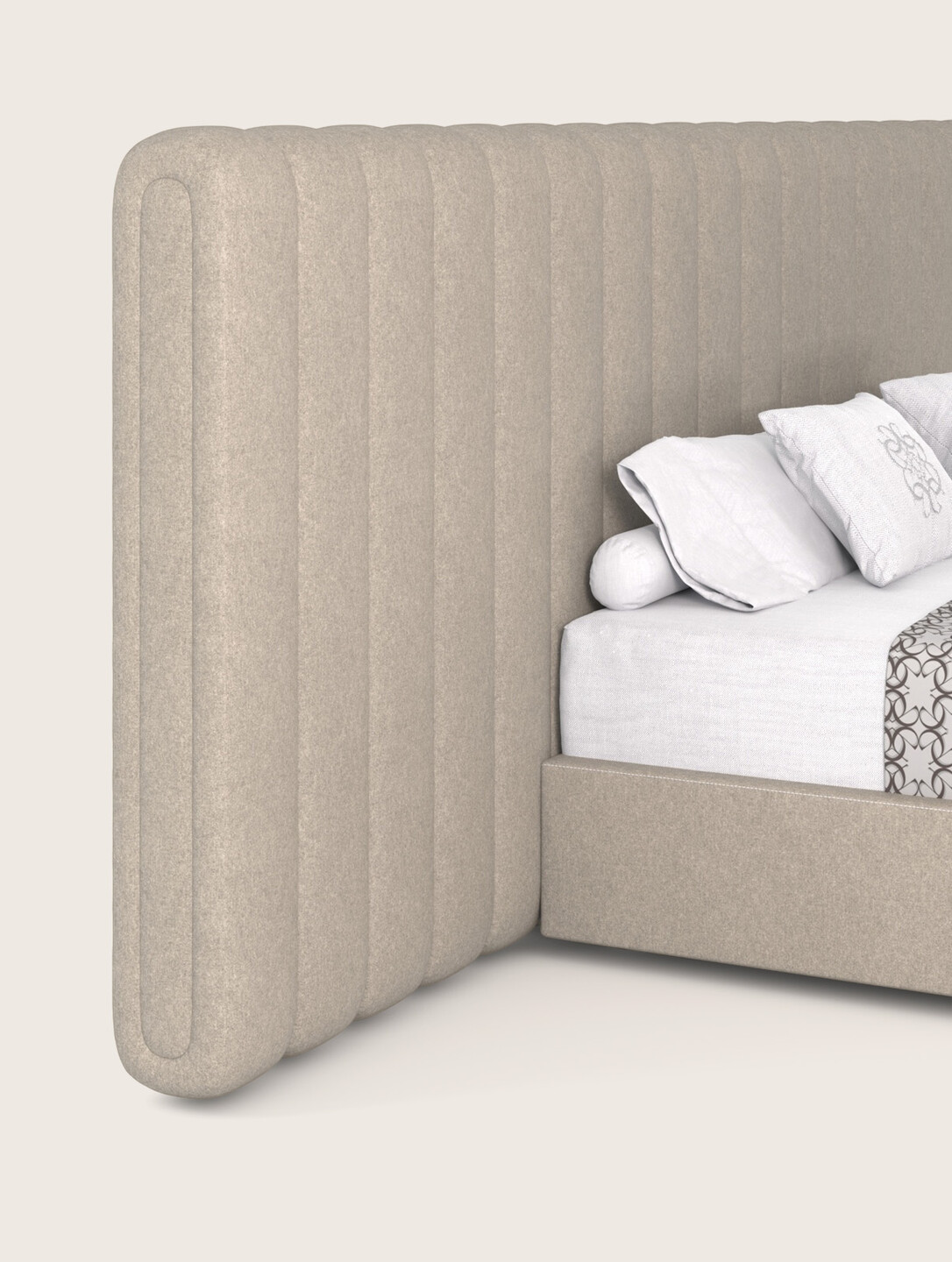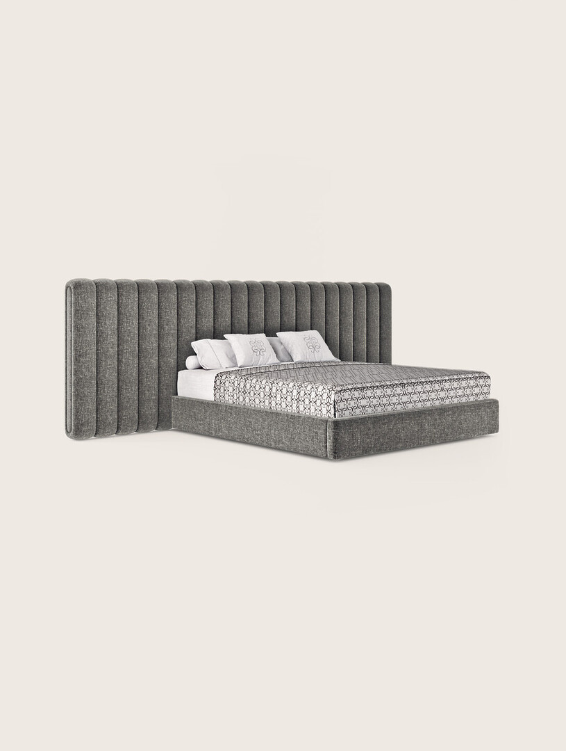 Crafted with a durable plywood structure and padded with plush polyurethane foam, it is fully upholstered in luxurious fabric or leather from the collection. Its defining feature is the statement headboard, composed of individual elements arranged side by side to create generous, architectural volumes. Designed for both style and practicality, the bed is available for 180 cm and 200 cm mattresses and includes a frame with height-adjustable supports for personalized comfort. A customizable power outlet can be integrated as an optional extra, seamlessly blending convenience with sophistication. Mattress and slatted base not included.