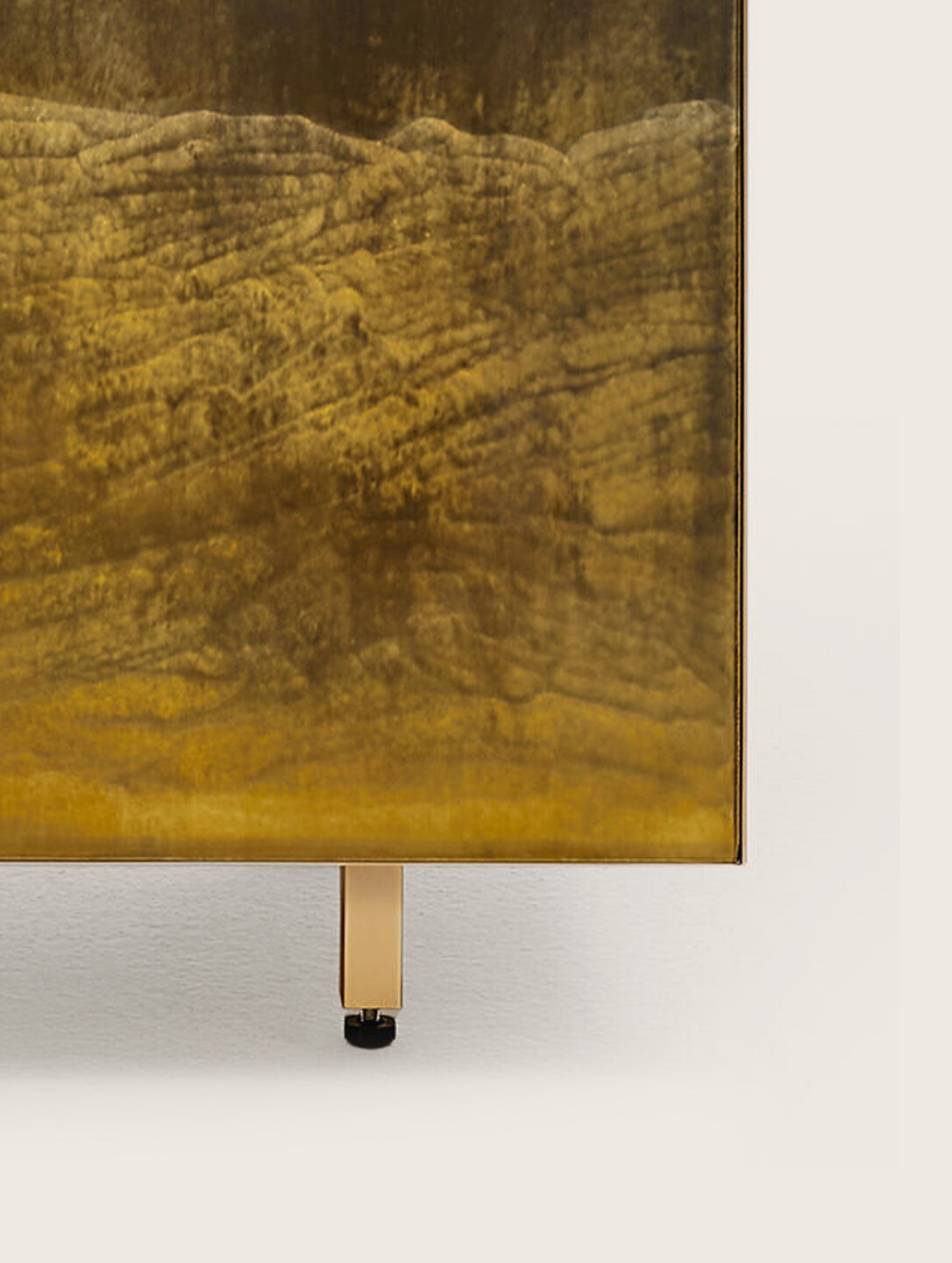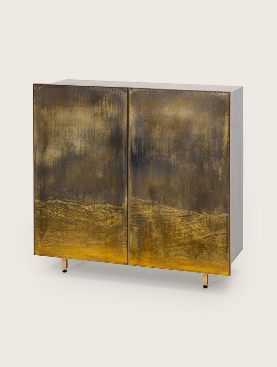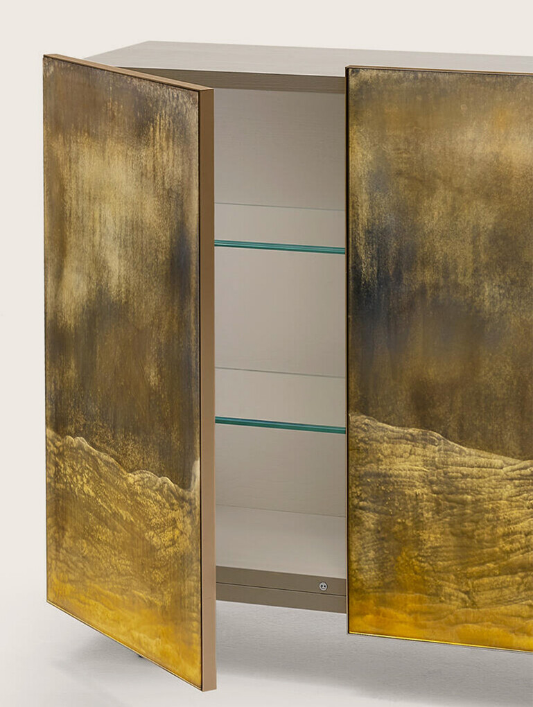 Defined by its clean, architectural silhouette, the piece is elevated through exquisite hand-engraved glass doors featuring the signature Gargano finish—an abstract interplay of gold and antique silver that captures light with subtle dynamism. Crafted from lacquered brushed ash wood and enriched with artisanal detailing, Nicandro seamlessly balances minimalist form with decorative depth.