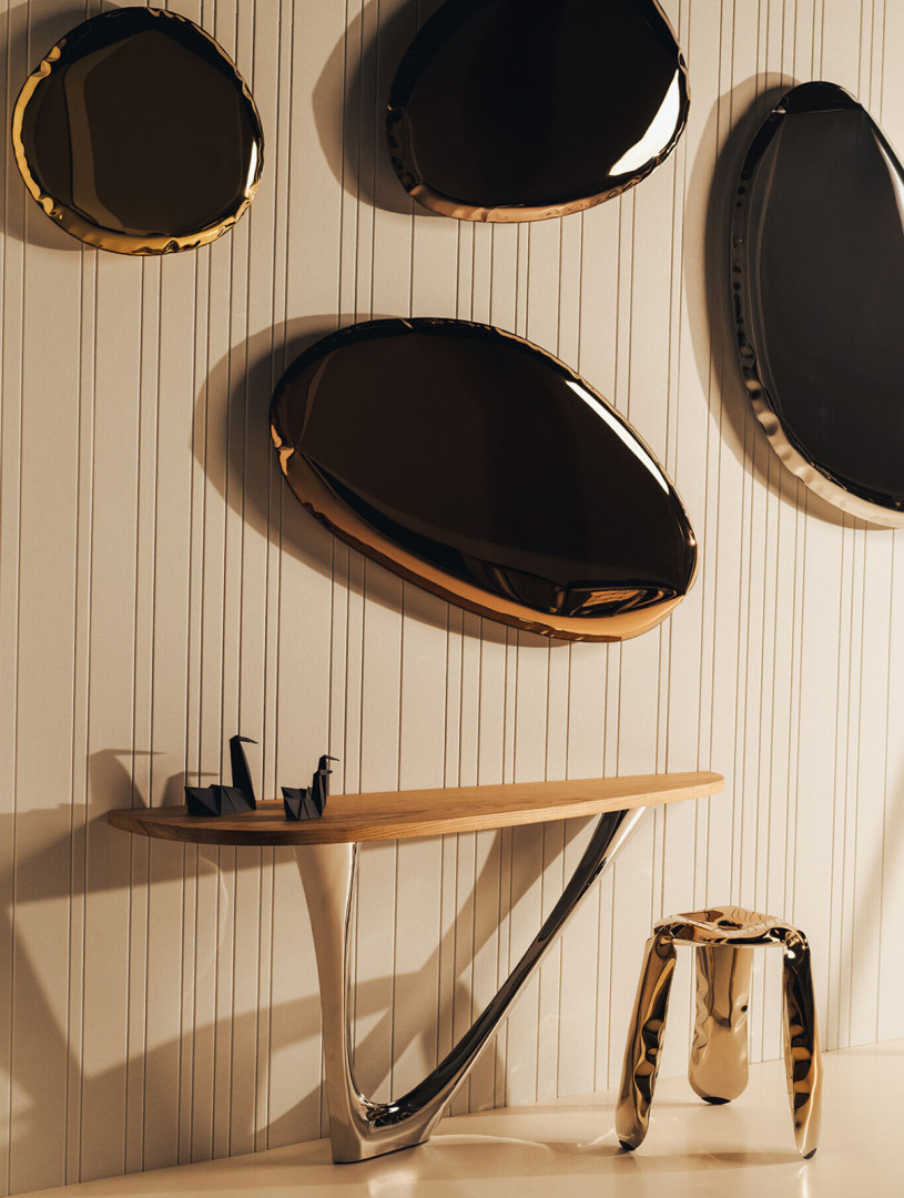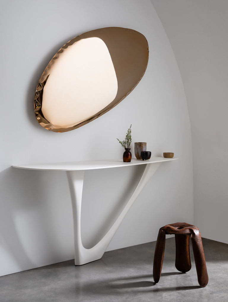 The Tafla O Mirror, from the Zieta Collection, is a sculptural design object that seamlessly merges art, technology, and function.