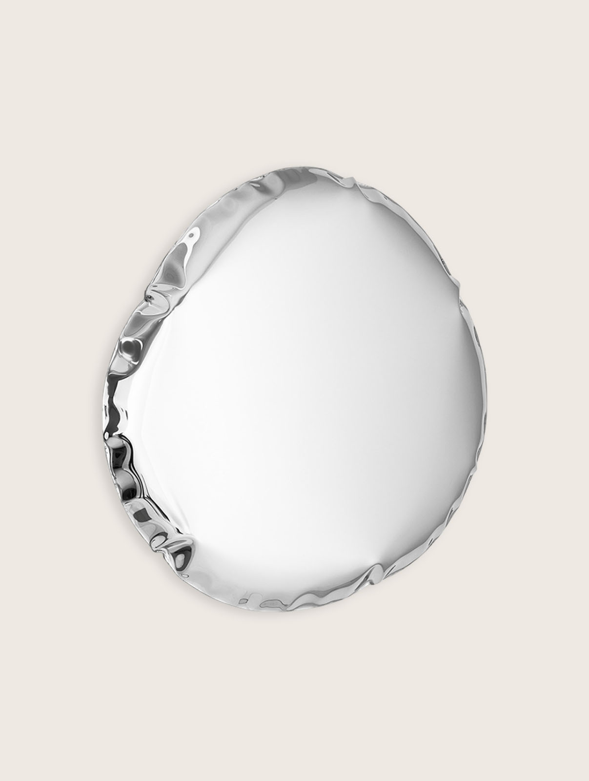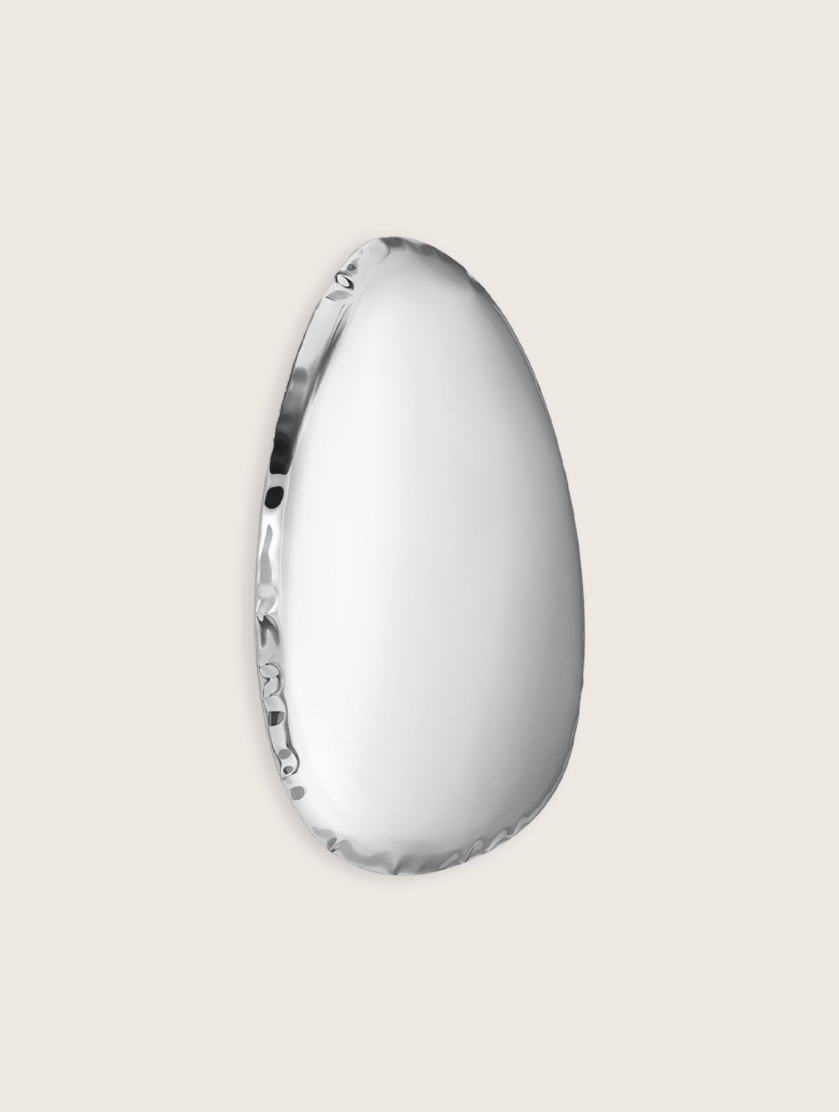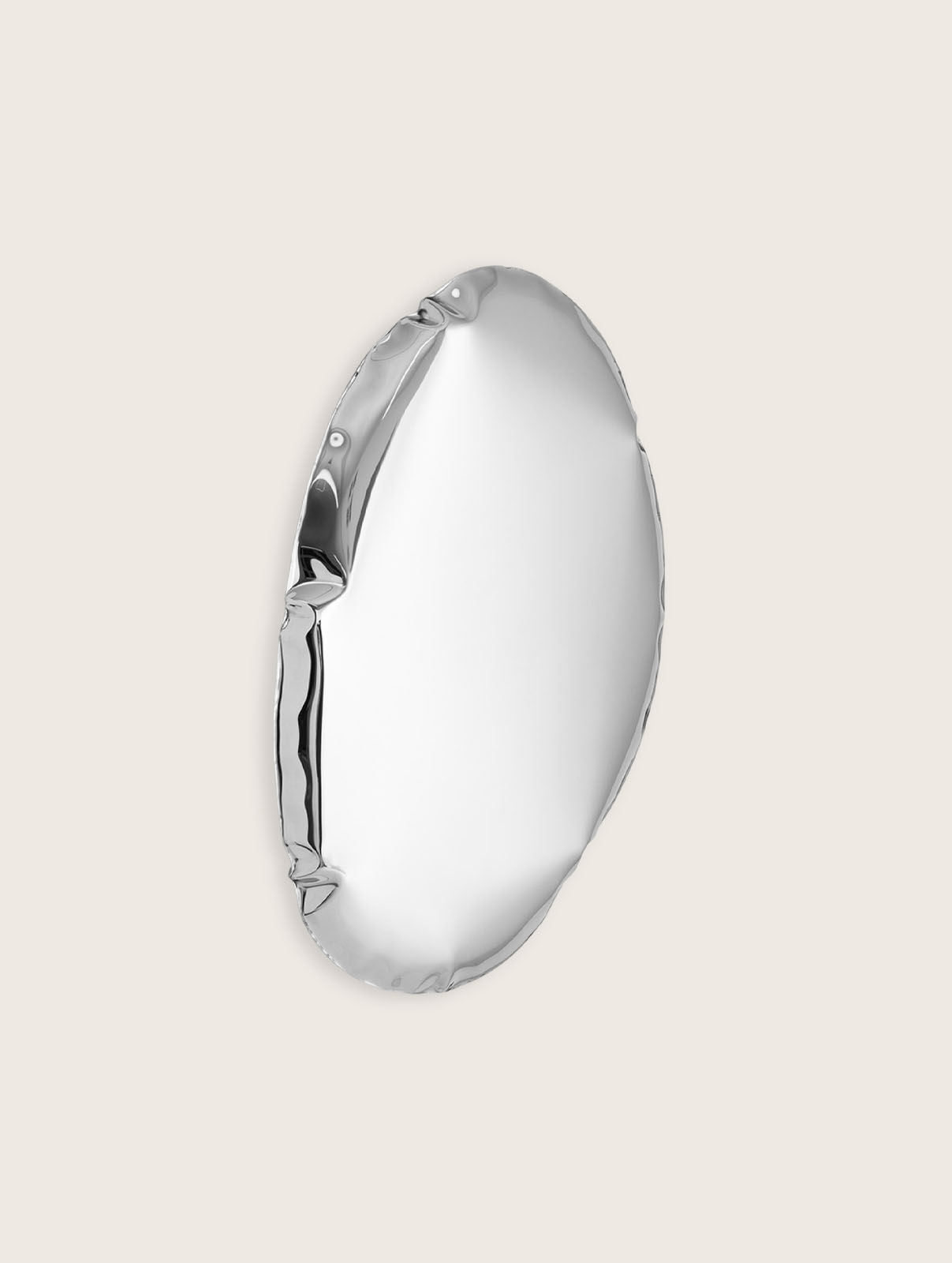 Crafted from polished stainless steel and formed through a pioneering FiDU inflation process, each piece takes on a unique, organic shape inspired by liquid droplets—no two mirrors are ever the same. Rooted in the experimental ethos of the Zieta Collection—where flat metal is transformed through controlled deformation into expressive, three-dimensional forms—the Tafla O Mirror embodies innovation and imagination. Its softly distorted, reflective surface captures and refracts light, creating a dynamic interplay with its surroundings that evolves throughout the day.