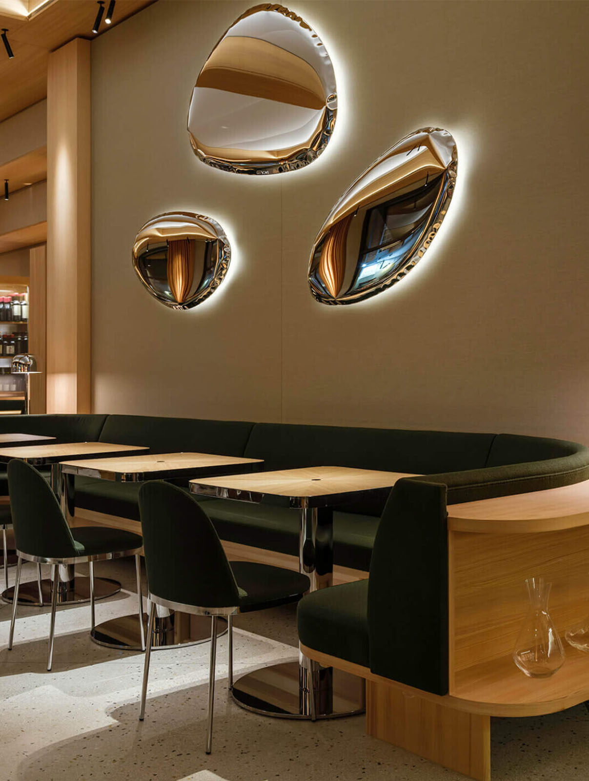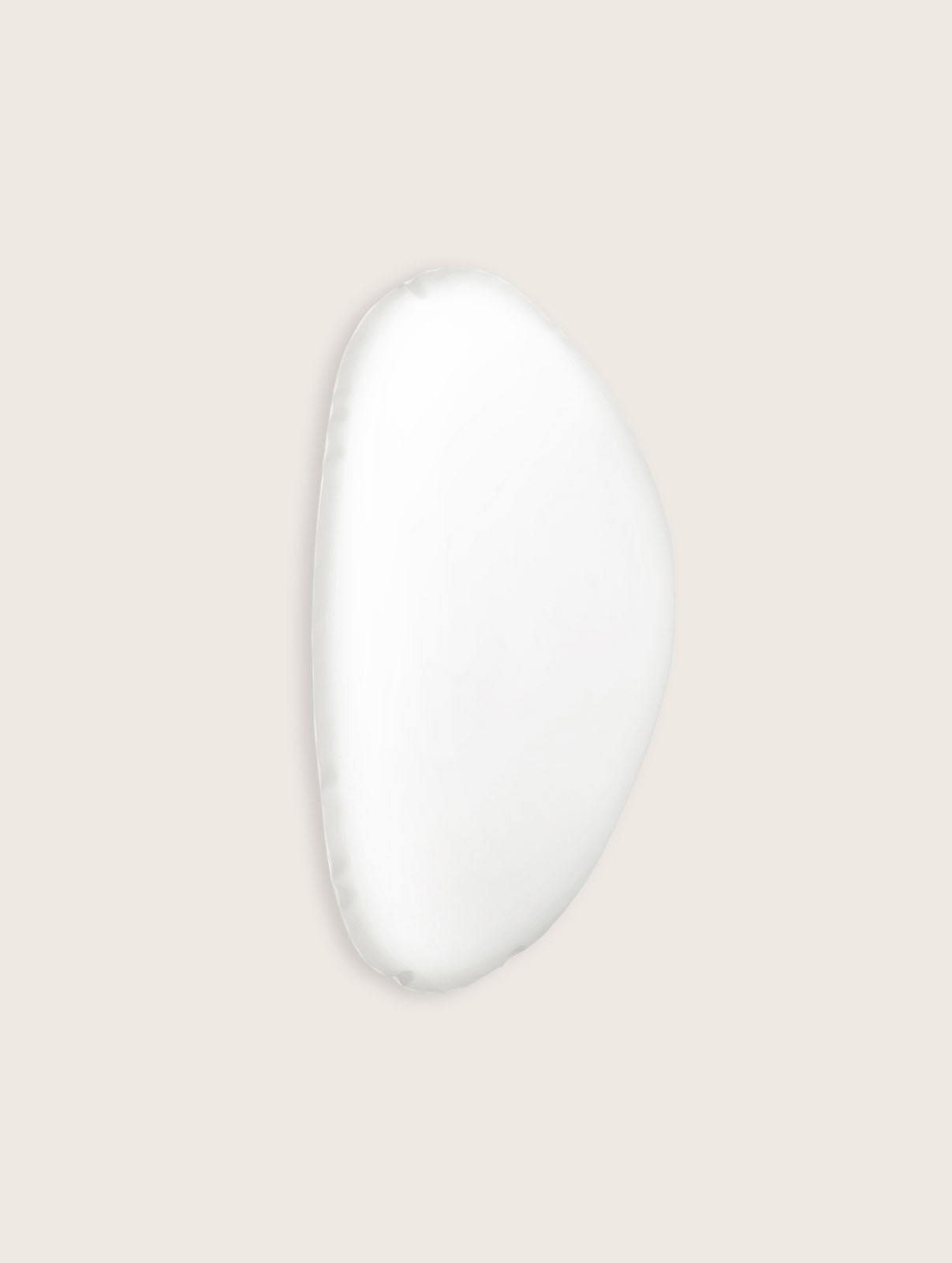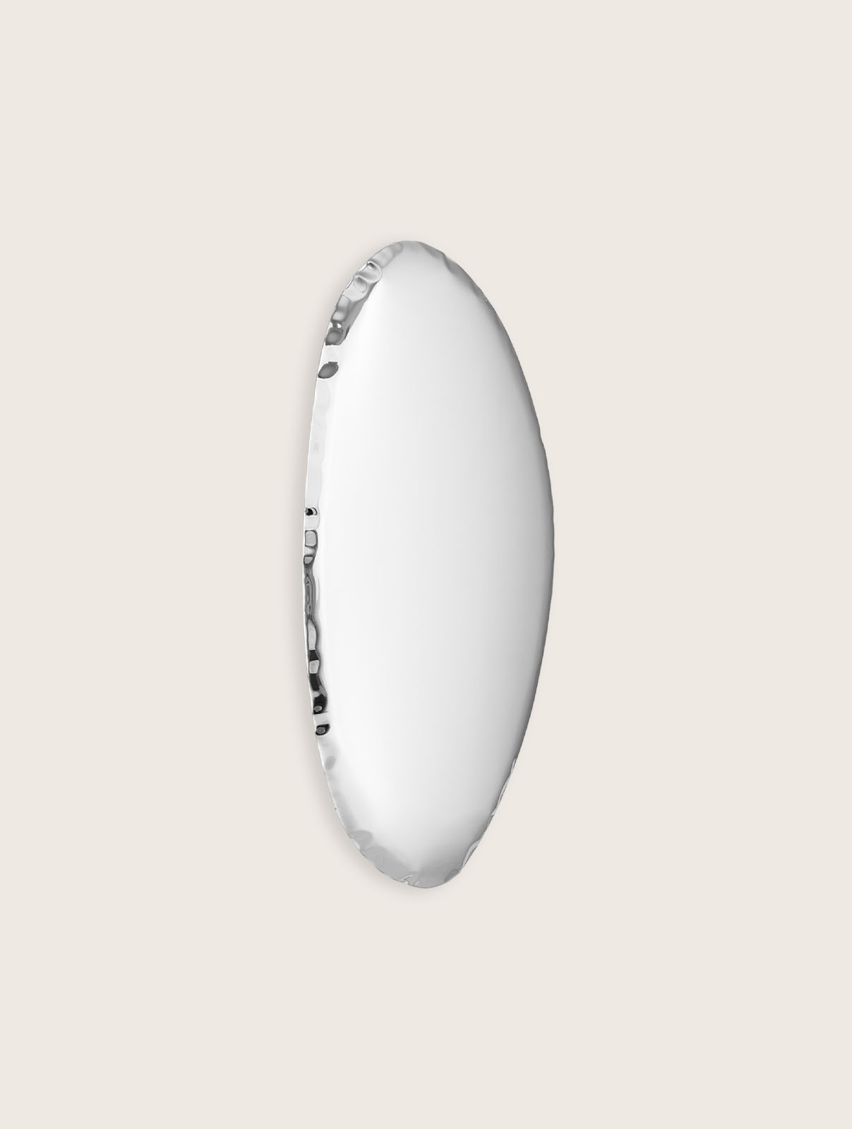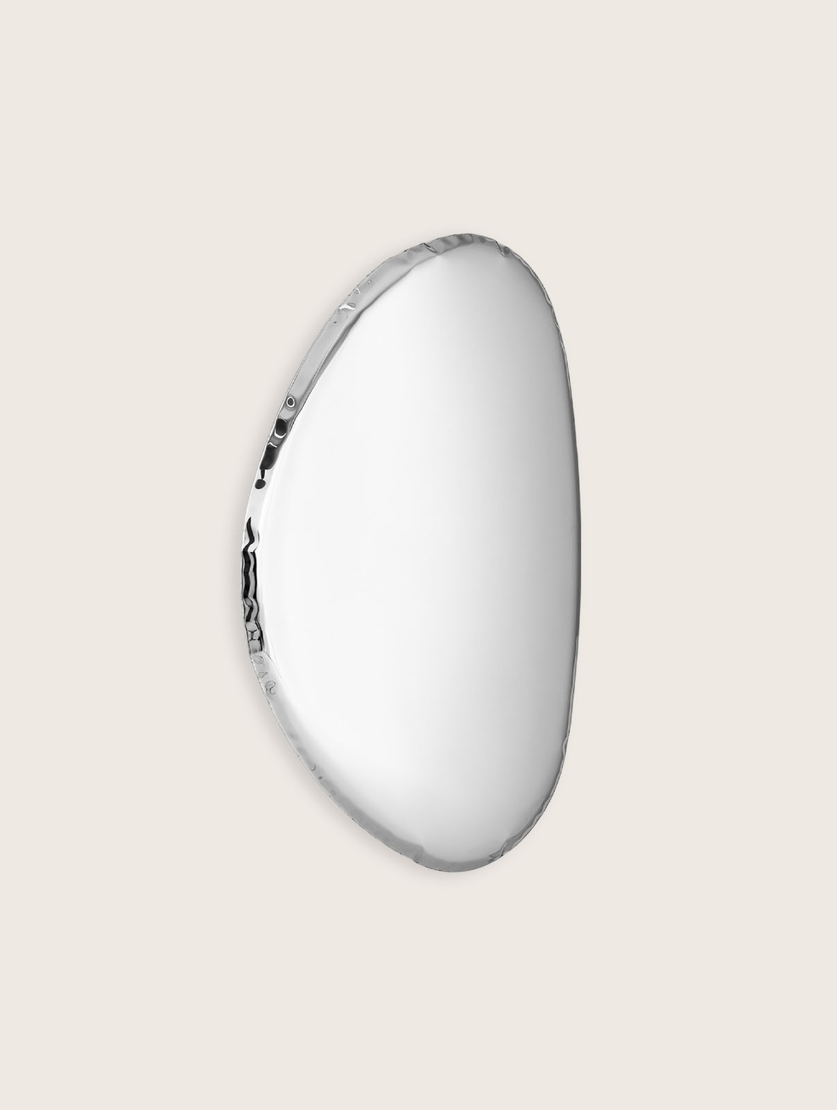Crafted from polished stainless steel and formed through a pioneering FiDU inflation process, each piece takes on a unique, organic shape inspired by liquid droplets—no two mirrors are ever the same. Rooted in the experimental ethos of the Zieta Collection—where flat metal is transformed through controlled deformation into expressive, three-dimensional forms—the Tafla O Mirror embodies innovation and imagination. Its softly distorted, reflective surface captures and refracts light, creating a dynamic interplay with its surroundings that evolves throughout the day.