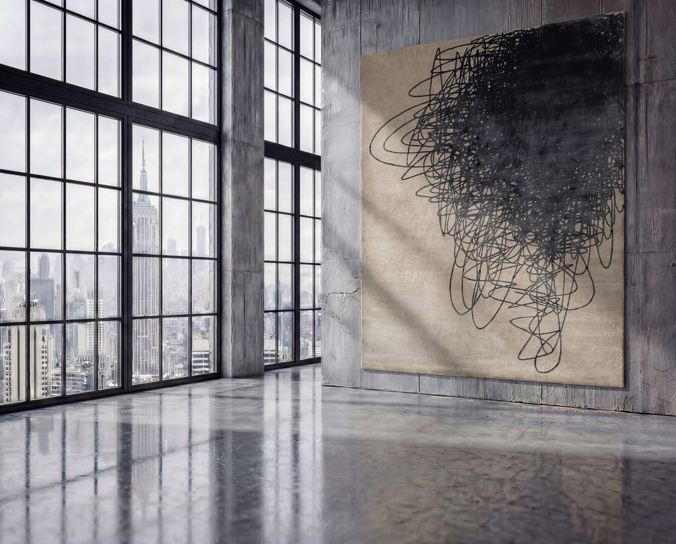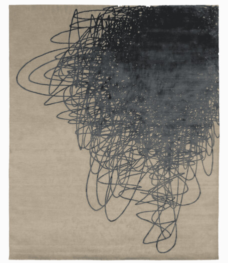 The VOYA carpet channels raw, expressive energy through an abstract masterpiece of dense, overlapping charcoal-black scribbles that cascade like a storm of spontaneous lines across a serene, warm neutral beige or soft taupe ground.